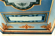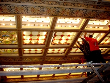 The restoration of the artistic ceilings took place from the dovetailed glass by the bullets after the fire that destroyed the glass ceiling and also the manufacture of transparent glass courts takes place to the ceiling that the fires devoured it totally and the ceiling an expression about a wonderful work of art the artist could return them to their origin .
