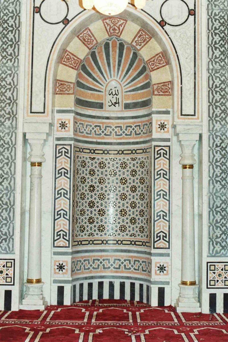 In it the work of the marble coverings took place to the concrete pillars by the column of the work of the Andalusian model and also designing the ornamental ceilings took place on the Mamluke ornamental model and by it many of the engineering branches and the vegetable ones and also the execution of the works of the dovetailed glass by the plaster and the bullets and also the execution of direction of the Kaaba in the mosque and the shrine related to the mosque friend and she is also on the Mamluke model and the execution of the written tapes and he is the ornamented Kufic script by the plaited vegetable drawings inside the mosque’s courtyard and also on the shrine walls from all its sides and the execution of the works of the marble rule to the shrine owner compartment .